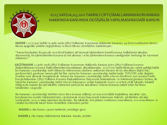 Seferihisar'da Çiftçi Malları Koruma Meclisi 2012 Yılında 10 Yıl geriye kadar giden zamanlarda Üyelerinden yıllık munzam sandık aidatlarını almakta zorluk çekmiş ve tahsilatlarda başarısız olmuştur. Bu nedenle geçmiş yıllarda, uzun dönemler boyunca çalışanlarına SSK borçlarını dahi ödenmemiştir. 2011 yılı Mart ayında Yasanın 4081 Sayılı Yasaya yaptığı değişiklikten sonra tahsilat da başarı daha da zorlaşmış ve Seferihisar ÇMK 2012 yılında emekli olan bir işçisine çok zorlanarak 1 yıl içersinde Emeklilik tazminatını ödemiş ve ardından da Haziran 2013 tarihinden itibaren çalışanlarına maaş ödeyemez yada ödesede son derece geriden gelen ve zaman zaman 6-7 ayı bulan gecikmelerle, geçmiş aylardan kalan borçların bir kısmı ödenerek yapılır hale düşmüştür. Aynı dönemde 1 yıldan fazla kira ve 3 yıldan fazla muhasebe borçlarını ödeyememiş zaman zaman da telefon ve İnternete olan borçları nedeni ile kesintiye uğramıştır. Son bir kaç yılda Kurumu hiç bir taşıtı yoktur. Personelin kendine ait işe gelmek için kullandıkları motosikletler Kurumun arazi kontrol sorun ve şikayet giderme görevlerinde personele rica ve minnet karşılığı ve Kurum tarafından yakıtları sağlanarak yada sözü geçen taşıtların arızalanması durumunda Kurum Yönetim Kurulu Üyelerinin cebinden ödedikleri maddi bedellerle acze çözüm kavlinden hallerle giderilmiş duruma gelinmiştir.
