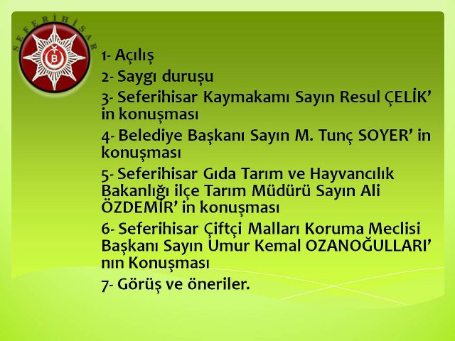 04.11.2014 Tarihinde Seferihisar Kaymakamı Sayın Resul ÇELİK, Seferihisar Belediye Başkanı Sayın Tunç SOYER, Seferihisar İlçe Tarım Müdürü Sayın Ali ÖZDEMİR ve Seferihisar Çiftçi Malları Koruma Meclisi Başkanı Umur Kemal OZANOĞULLARI ve Tüm Yönetim Kurulu Üyelerinin hazır olduğu Üyelerimizin, Çiftçilerimizin, Sayın Basın Mensuplarının ve Misafirlerimizin katılımı ile Çiftçi Malları Koruma Meclisi Başkalığının sorunlarına yönelik Toplantı gerçekleştirilmiştir.